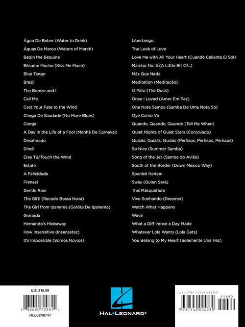 50 well-known Latin classics are included in this collection for easy piano with lyrics. Includes: Água De Beber (Water to Drink) · Bésame Mucho (Kiss Me Much) · Conga · A Day in the Life of a Fool (Manha De Carnaval) · Desafinado · Frenesí · The Girl from Ipanema (Garota De Ipanema) · Hernando's Hideaway · How Insensitive (Insensatez) · Libertango · Mas Que Nada · Meditation (Meditacao) · One Note Samba (Samba De Uma Nota So) · Oye Como Va · Quiet Nights of Quiet Stars (Corcovado) · So Nice (Summer Samba) · Sway (Quien Sera) · Wave · You Belong to My Heart (Solamente Una Vez) · and more.