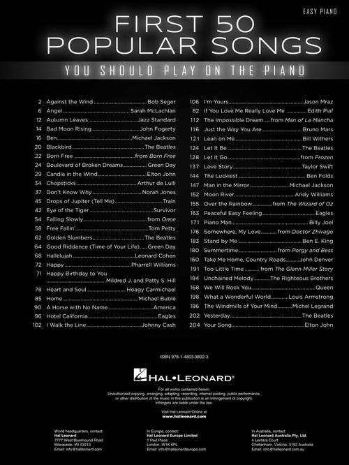 50 great pop classics for beginning pianists to learn, including: Autumn Leaves · Candle in the Wind · Chopsticks · Don't Know Why · Good Riddance (Time of Your Life) · Hallelujah · Happy · Happy Birthday to You · Heart and Soul · Hotel California · I Walk the Line · Just the Way You Are · Let It Be · Let It Go · Your Song · Moon River · Over the Rainbow · Piano Man · Stand by Me · Summertime · Unchained Melody · What a Wonderful World · Yesterday · and more.