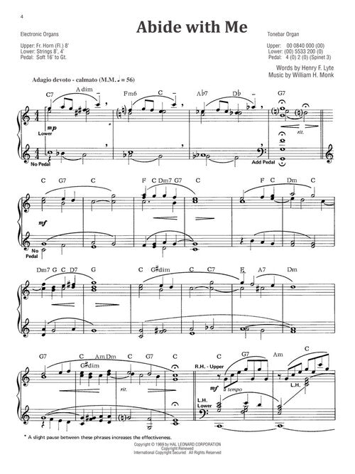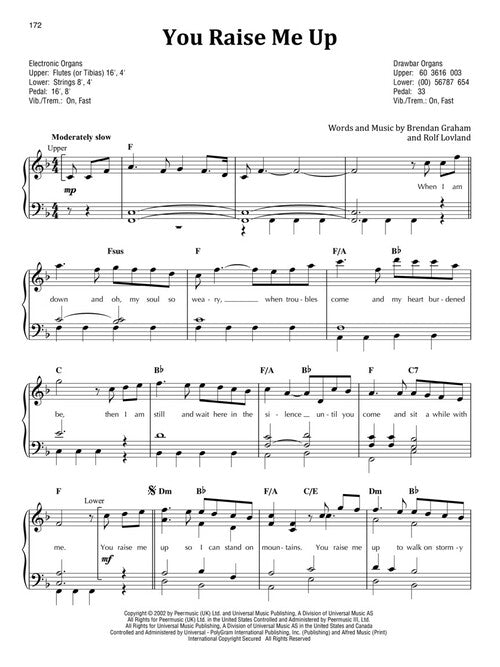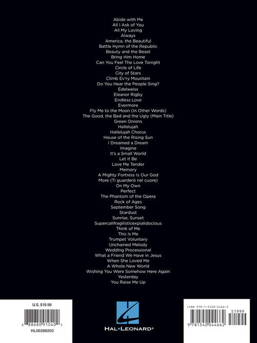This one-of-a-kind collection features 50 accessible organ arrangements with lyrics of must-know songs: Abide with Me · Battle Hymn of the Republic · City of Stars · Eleanor Rigby · Green Onions · Hallelujah Chorus · It's a Small World · Love Me Tender · Memory · On My Own · The Phantom of the Opera · Sunrise, Sunset · Trumpet Voluntary · Wedding Processional · You Raise Me Up · and more.