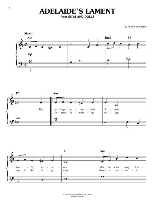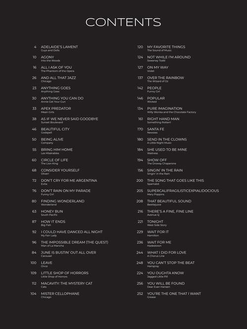 This essential collection features 50 simple arrangements of must-know Broadway showstoppers from hit shows like Chicago, Dear Evan Hansen, Godspell, Hadestown, Hairspray, Hamilton, Jagged Little Pill, Les Miserables, The Lion King, My Fair Lady, Newsies, Sound of Music, West Side Story, Wicked, and more! Songs include: All I Ask of You · And All That Jazz · Anything Goes · Consider Yourself · Don't Cry for Me Argentina · The Impossible Dream (The Quest) · My Favorite Things · Over the Rainbow · The Phantom of the Opera · Popular · Send in the Clowns · She Used to Be Mine · Tonight · Wait for Me · You Oughta Know · You're the One That I Want · and more.