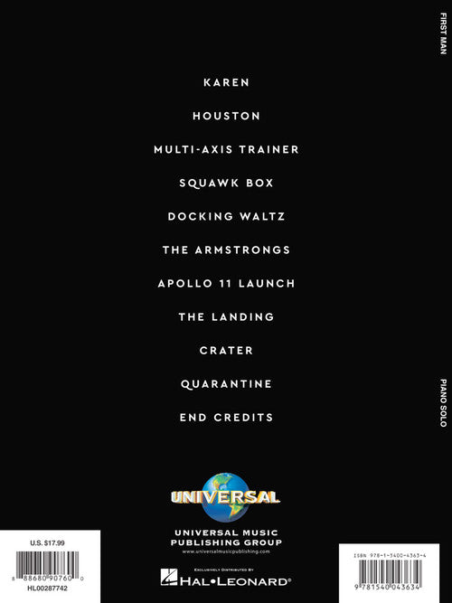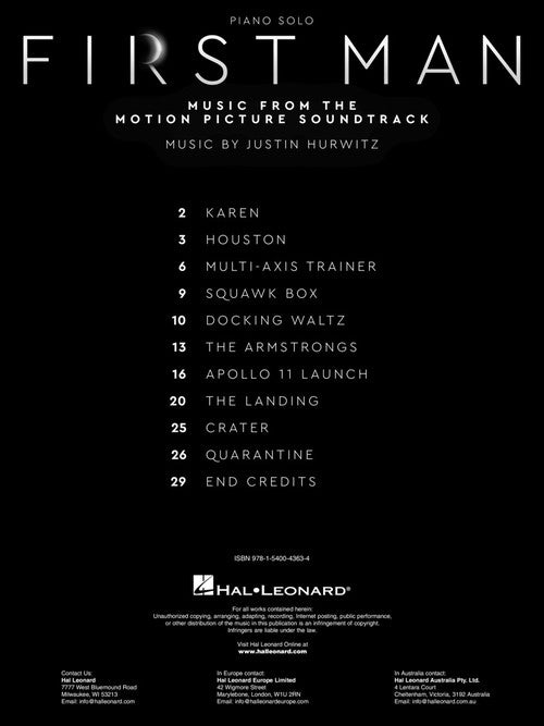 Damien Chazelle, Justin Hurwitz and Ryan Gosling follow up on their La La Land success by teaming together once again in this 2018 biographical drama. Our songbook features 11 tracks from Hurwitz' soundtrack, arranged for piano solo: Apollo 11 Launch · The Armstrongs · Crater · Docking Waltz · End Credits · Houston · Karen · The Landing · Multi-Axis Trainer · Quarantine · Squawk Box.