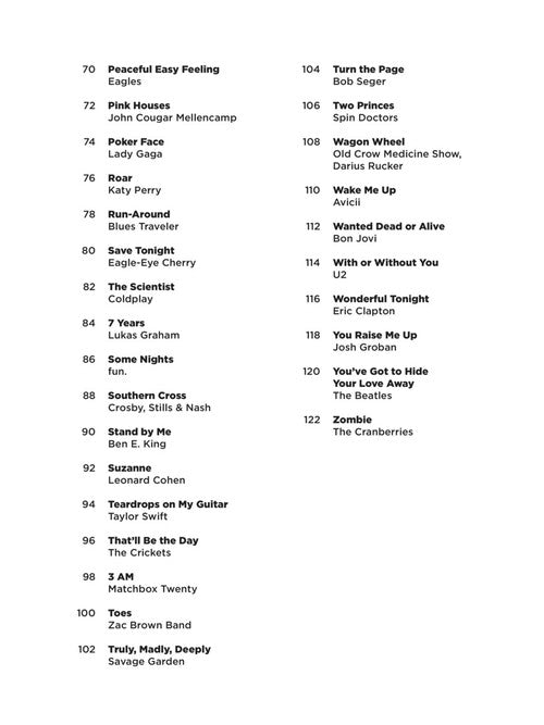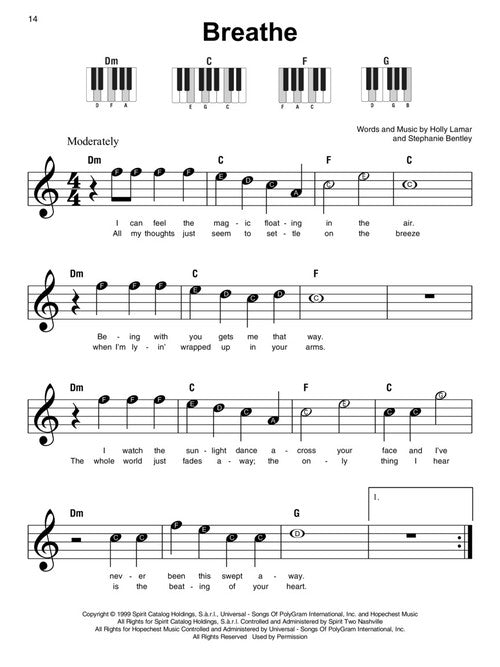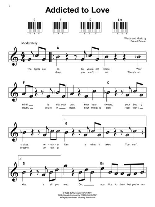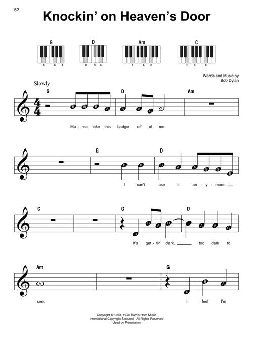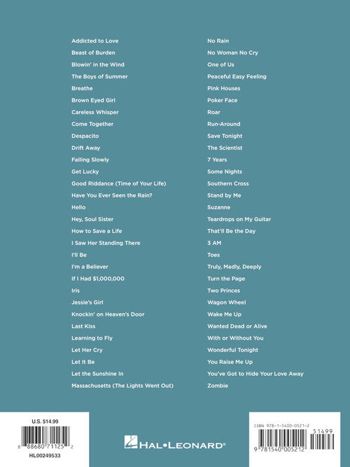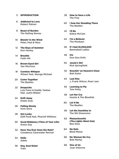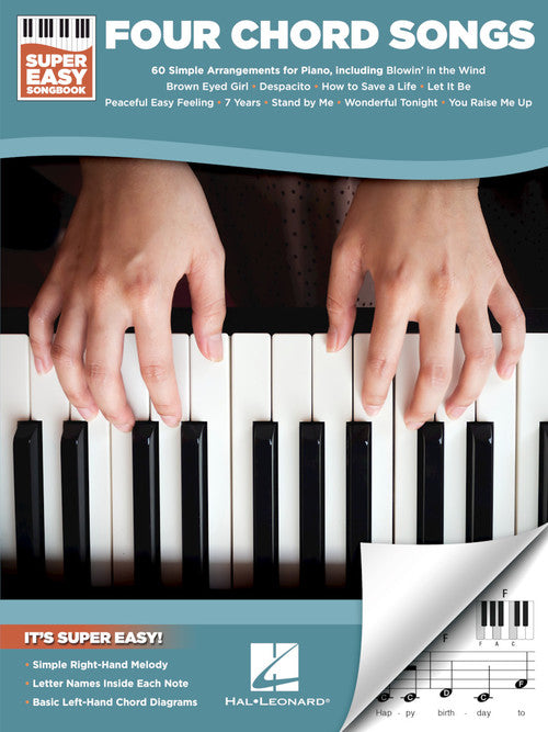 It's super easy! This series features accessible arrangements for piano, with simple right-hand melody, letter names inside each note, basic left-hand chord diagrams, and no page turns. This edition includes 60 hits that only require four chords: Blowin' in the Wind · Brown Eyed Girl · Careless Whisper · Despacito · Good Riddance (Time of Your Life) · How to Save a Life · Hey, Soul Sister · I'm a Believer · Jessie's Girl · Last Kiss · Let It Be · No Rain · Peaceful Easy Feeling · 7 Years · Stand by Me · Toes · Wonderful Tonight · You Raise Me Up · and many more.