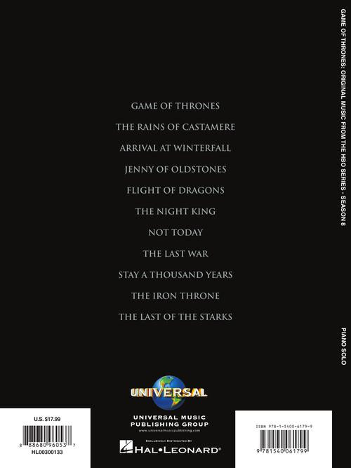 11 songs from the much anticipated final season of Game of Thrones, which earned a record number of Emmy Award nominations in 2019: Arrival at Winterfell · Flight of Dragons · Game of Thrones · The Iron Throne · Jenny of Oldstones · The Last of the Starks · The Last War · The Night King · Not Today · The Rains of Castamere · Stay a Thousand Years.