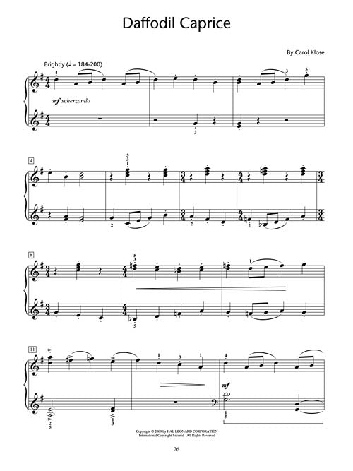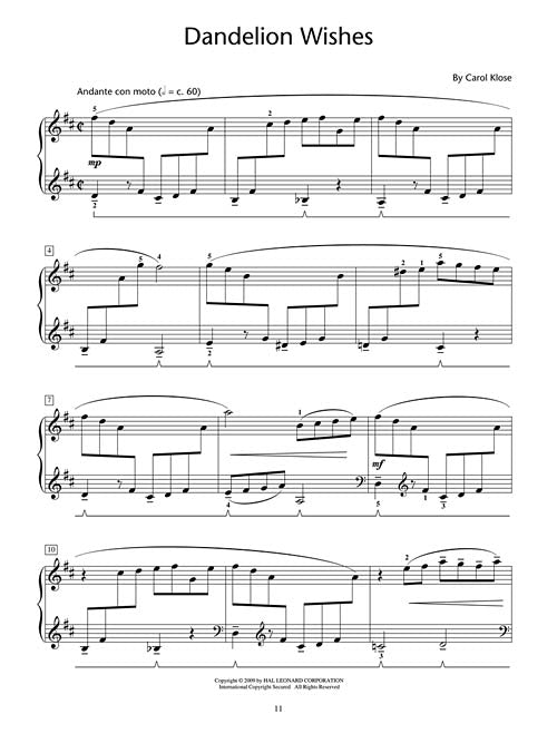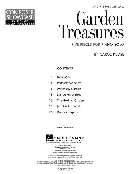 Garden Treasures delights the senses with a variety of sounds, keyboard techniques and moods. From the peaceful tranquility of The Healing Garden to the whimsy of Daffodil Caprice or Dandelion Wishes, this late-intermediate level collection is perfect for introducing students to impressionistic harmonies and keyboard choreography. Pieces include: Daffodil Caprice · Dandelion Wishes · The Healing Garden · Jasmine in the Mist · Water Lily Garden.