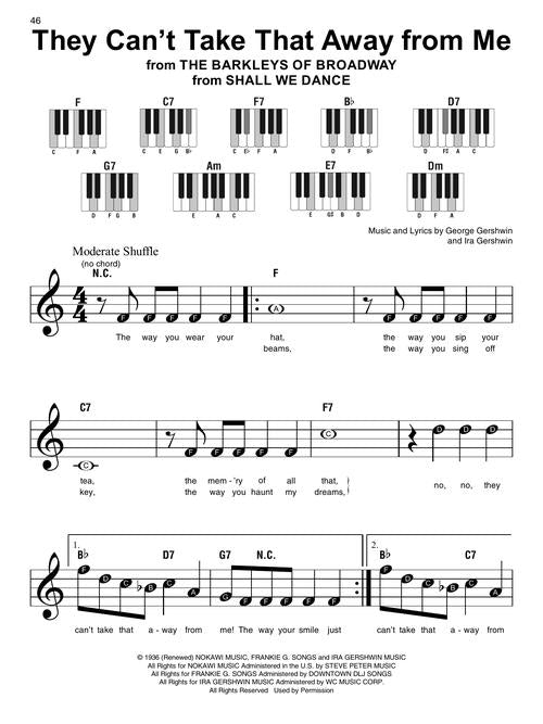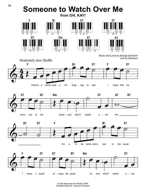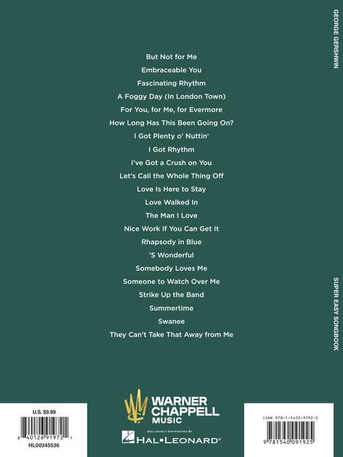 It's super easy! This series features accessible arrangements for piano, with simple right-hand melody, letter names inside each note, basic left-hand chord diagrams, and no page turns. Lyrics are also included. This edition includes 22 Gershwin classics: But Not for Me · Embraceable You · Fascinating Rhythm · I Got Rhythm · I've Got a Crush on You · Let's Call the Whole Thing Off · Nice Work If You Can Get It · Rhapsody in Blue · Someone to Watch over Me · Summertime · They Can't Take That Away from Me · and more.