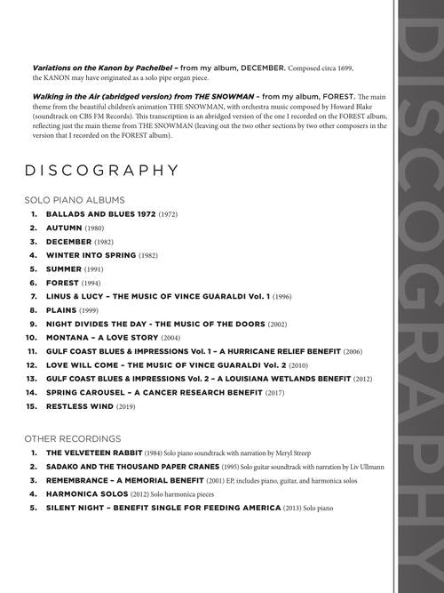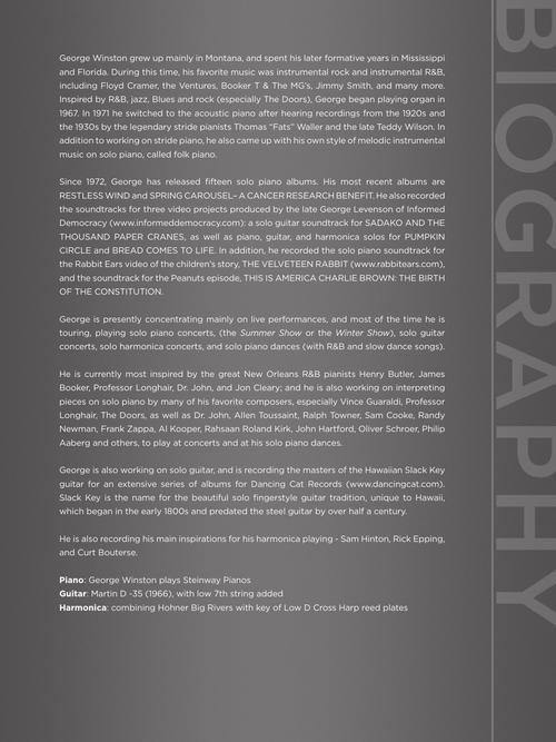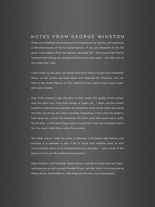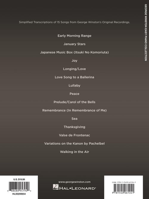 This collection features 15 simplified transcriptions for piano from George Winston's original recordings, authorized by Mr. Winston himself. In addition, the book includes an introduction, song notes, and playing tips and practicing priorities from the composer. Songs include: Early Morning Range · January Stars · Japanese Music Box (Itsuki No Komoriuta) · Joy · Longing/Love · Love Song to a Ballerina · Lullaby · Peace · Prelude/Carol of the Bells · Remembrance (In Remembrance of Me) · Sea · Thanksgiving · Valse De Frontenac · Variations on the Kanon by Pachelbel · Walking in the Air.