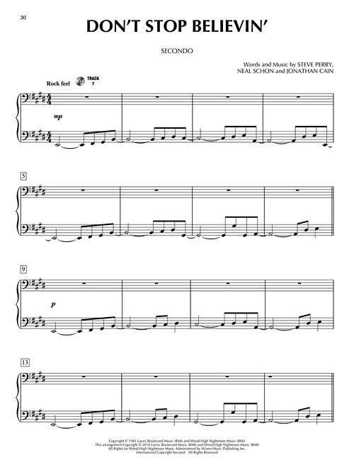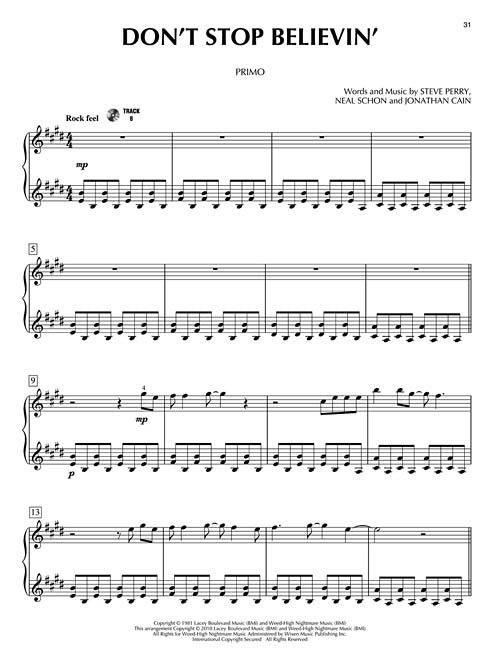 The Piano Duet Play-Along series gives you the flexibility to rehearse or perform piano duets anytime, anywhere! Play these duet arrangements with a partner, or use the accompanying CD to play along with either the Secondo or Primo part on your own. The audio CD is playable on any CD player, and also enhanced so PC and Mac users can adjust the recording to any tempo without changing pitch. Features 9 great duets: Alone · Bad Romance · Defying Gravity · Don't Stop Believin' · Endless Love · I Dreamed a Dream · Like a Prayer · My Life Would Suck Without You · True Colors.