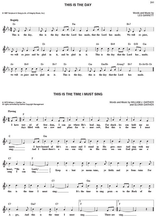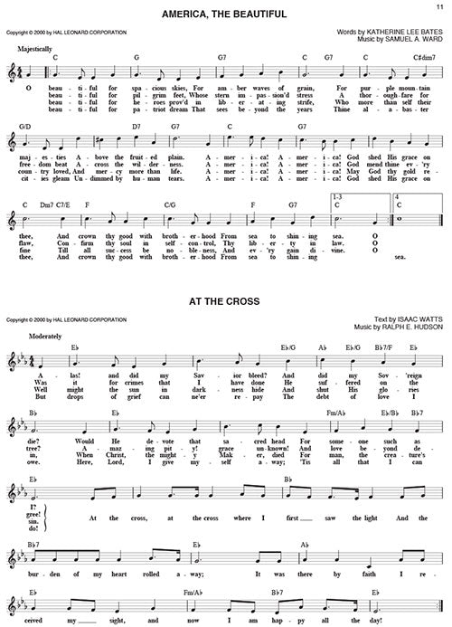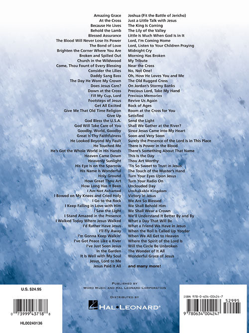 This excellent resource for Gospel titles features 449 songs, including: Amazing Grace · At the Cross · Because He Lives · Behold the Lamb · Blessed Assurance · Church in the Wildwood · The Day He Wore My Crown · Give Me That Old Time Religion · He Looked Beyond My Fault · He Touched Me · Heavenly Sunlight · His Eye Is on the Sparrow · Holy Ground · How Great Thou Art · I Bowed on My Knees and Cried Holy · I Saw the Light · I'd Rather Have Jesus · In the Garden · Joshua (Fit the Battle of Jericho) · Just a Little Talk with Jesus · Lord, I'm Coming Home · Midnight Cry · Morning Has Broken · My Tribute · Near the Cross · The Old Rugged Cross · Precious Memories · Rock of Ages · Shall We Gather at the River? · There Is Power in the Blood · We Shall Wear a Crown · What a Friend We Have in Jesus · and hundreds more!