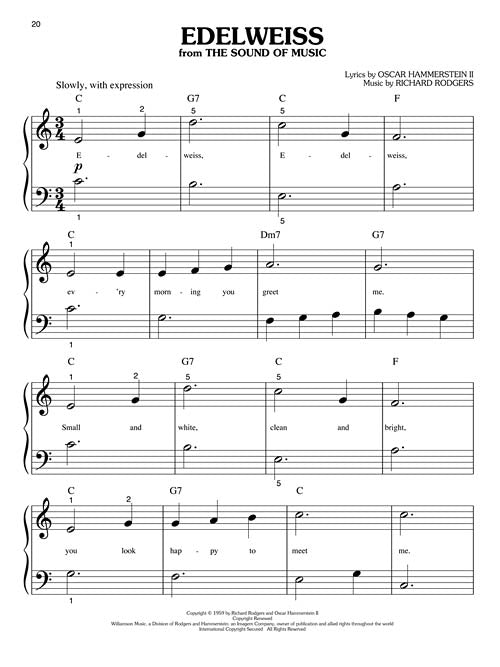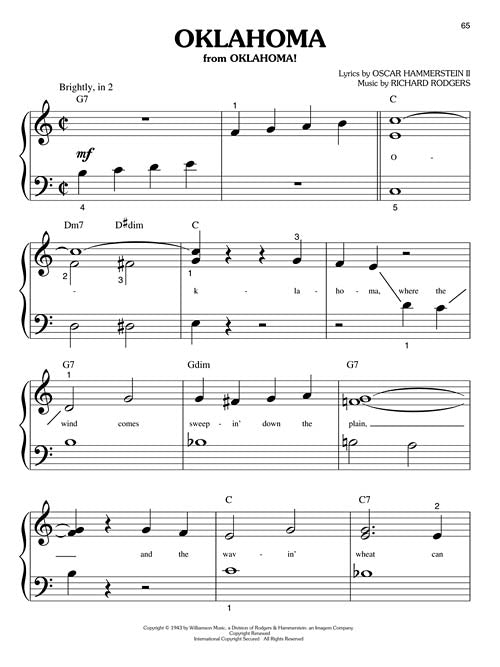 30 super songs from the renowned songwriting duo, expertly arranged for big-note piano! Includes: Bali Ha'i · Climb Ev'ry Mountain · Do-Re-Mi · Edelweiss · Honey Bun · June Is Bustin' Out All Over · Maria · My Favorite Things · Some Enchanted Evening · and dozens more.