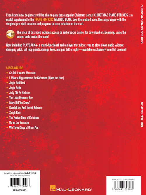 A perfect companion to the Piano for Kids Hal Leonard Method instruction book, this Christmas songbook by Jennifer Linn features a dozen yuletide favorites for beginning pianists. Includes: Go, Tell It on the Mountain · I Want a Hippopotamus for Christmas · Jingle Bell Rock · Jingle Bells · Jolly Old St. Nicholas · The Little Drummer Boy · Mary, Did You Know? · Rudolph the Red-Nosed Reindeer · Sleigh Ride · The Twelve Days of Christmas · Up on the Housetop · We Three Kings of Orient Are. Includes access to online audio tracks for each song.