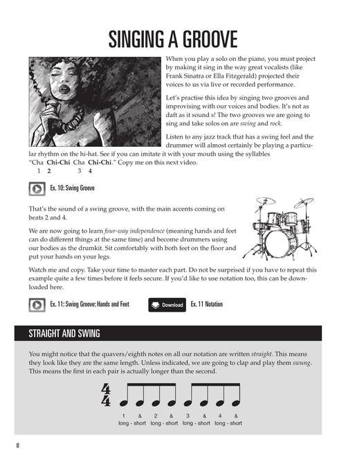 Here is a fun, easy course that teaches children how to improvise and play jazz piano faster than ever before. Kids will stay motivated as they improvise on popular children's songs arranged in a jazz style, while the opportunity to play alongside video accompaniments will inspire a love for performance. Every song seamlessly integrates a new improvisatory skill, systematically building upon previous learning and enabling the student to progress with confidence. Including exclusive access to video tutorials, this book is the definitive introduction to improvisation and jazz piano. The method can be used in combination with a teacher or parent. Topics covered include: swing and syncopation · echo playing · call and response · rock and swing grooves · improvising on 1-5 notes · hearing chord changes · 12-bar blues · and more.
