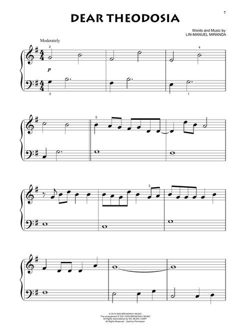 This folio features ten abridged arrangements from the hit Broadway musical sensation Hamilton for beginning pianists in their first or second years of study. Includes: Alexander Hamilton · Dear Theodosia · Helpless · It's Quiet Uptown · My Shot · One Last Time · The Schuyler Sisters · That Would Be Enough · Who Lives, Who Dies, Who Tells Your Story · You'll Be Back.