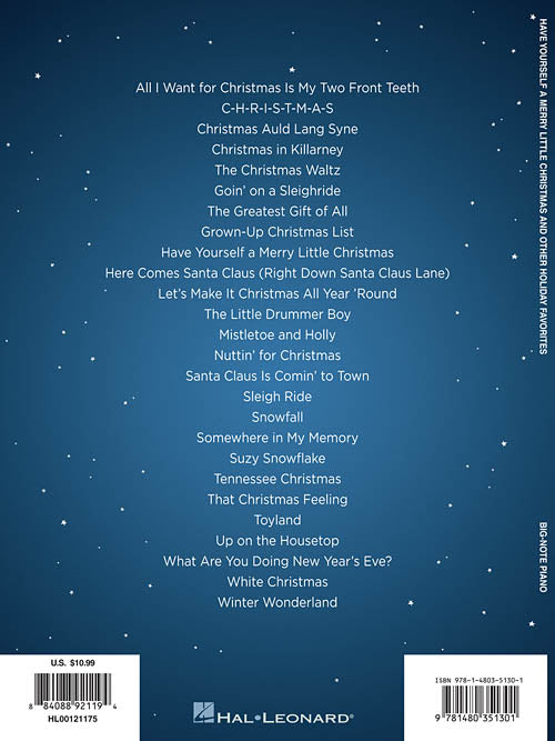 26 well-loved Christmas classics are presented in Big-Note Piano notation for budding pianists in this collection. Includes: All I Want for Christmas Is My Two Front Teeth · C-H-R-I-S-T-M-A-S · Grown-Up Christmas List · Here Comes Santa Claus (Right down Santa Claus Lane) · The Little Drummer Boy · Mistletoe and Holly · Nuttin' for Christmas · Santa Claus Is Comin' to Town · Toyland · Up on the Housetop · White Christmas · Winter Wonderland · and more.