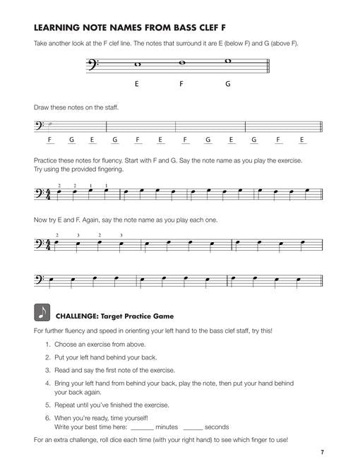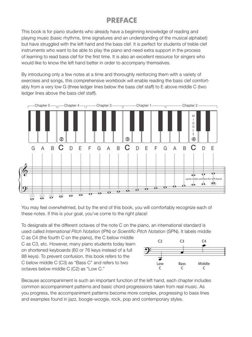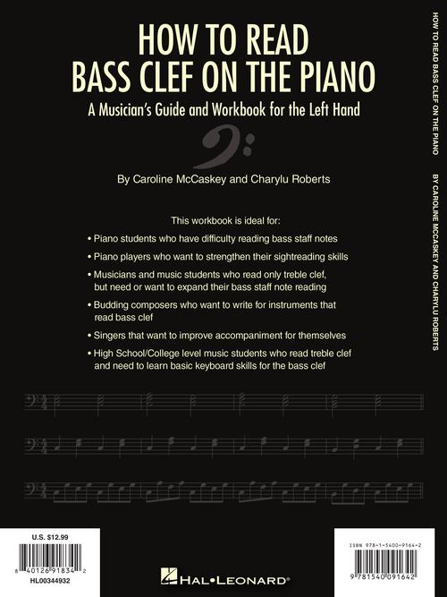 This workbook for the left hand on the piano is ideal for: piano students who have difficulty reading bass staff notes; piano players who want to strengthen their sightreading skills; musicians and music students who read only treble clef, but need or want to expand their bass staff note reading; budding composers who want to write for instruments that read bass clef; singers that want to improve accompaniment for themselves; or high school/college level music students who read treble clef and need to learn basic keyboard skills for the bass clef.