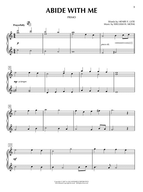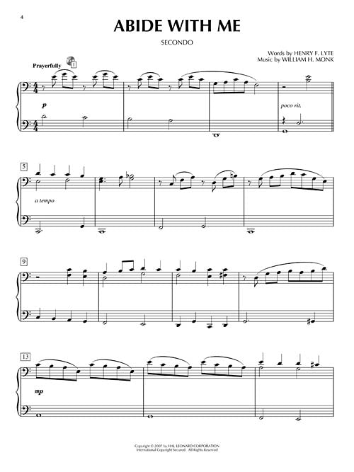 This great series comes with a CD that features separate tracks for the Primo and Secondo parts - perfect for practice and performance! Ten hymns arranged for 1 piano, 4 hands: Abide with Me · Amazing Grace · Beautiful Savior · Crown Him with Many Crowns · Holy, Holy, Holy · O Worship the King · The Old Rugged Cross · Onward, Christian Soldiers · Rock of Ages · What a Friend We Have in Jesus.