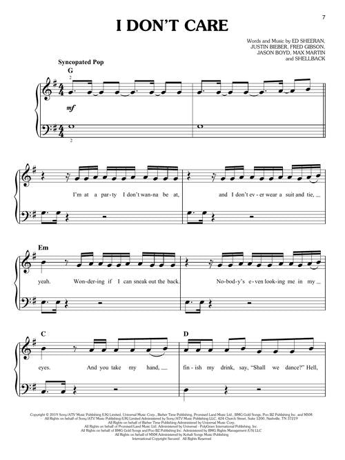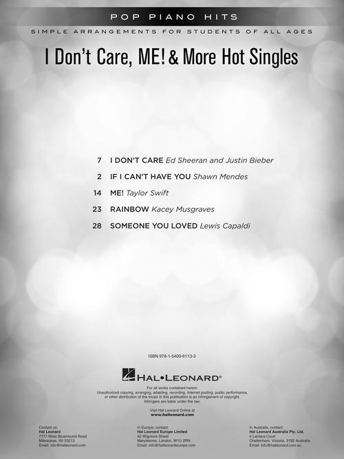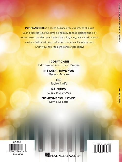 Pop Piano Hits is a series designed for students of all ages! Each book contains five simple and easy-to-read arrangements of today's most popular downloads. Lyrics, fingering and chord symbols are included to help you make the most of each arrangement. Enjoy your favorite songs and artists today! This edition contains: I Don't Care (Ed Sheeran & Justin Bieber) · If I Can't Have You (Shawn Mendes) · ME! (Taylor Swift) · Rainbow (Kacey Musgraves) · Someone You Loved (Lewis Capaldi).