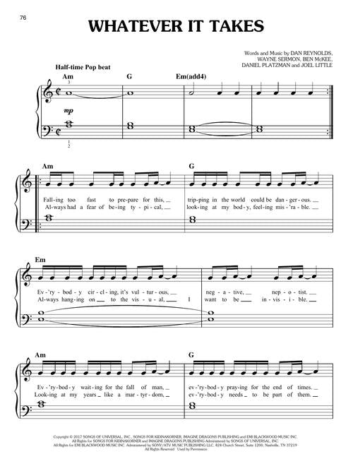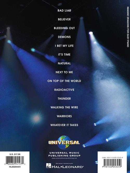 This folio features 14 Imagine Dragon hits arranged for easy piano with lyrics. Songs include: Bad Liar · Believer · Bleeding Out · Demons · I Bet My Life · It's Time · Natural · Next to Me · On Top of the World · Radioactive · Thunder · Walking the Wire · Warriors · Whatever It Takes.