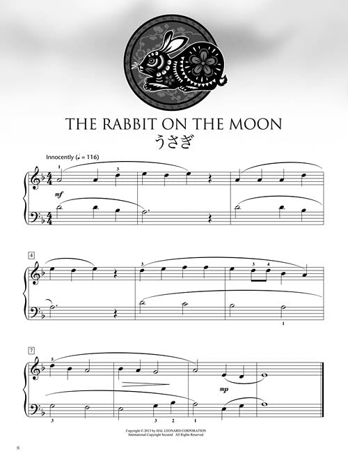 This unique collection features 24 traditional folk songs from Japan for intermediate level pianists: Blooming Flowers · Counting Game · The Fisherman's Song · Harvest Song · Itsuki Lullaby · Joyful Doll Festival · Kimigayo · Picking Tea Leaves · The Rabbit on the Moon · Sakura · Takeda Lullaby · Village Festival · Where Are You From? · and more. Includes a preface, author bio and performance notes.