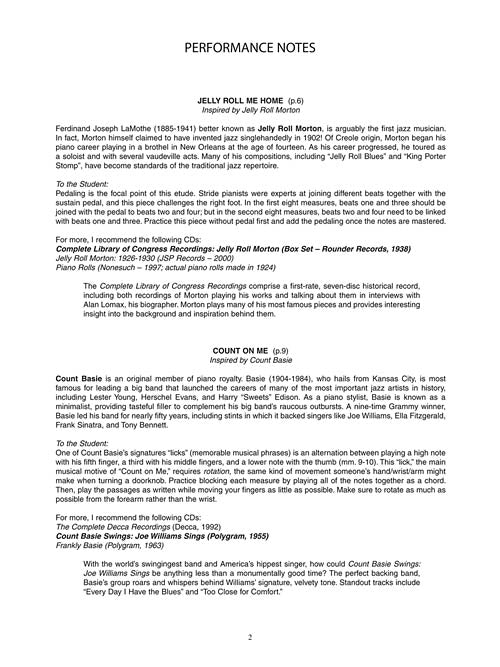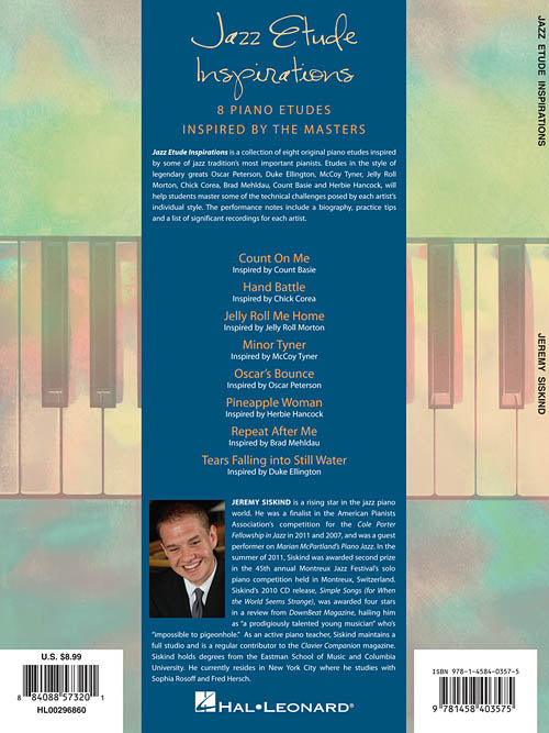 Jazz Etude Inspirations is a collection of eight original piano etudes inspired by some of the most important jazz pianists in history. Etudes in the style of legendary greats Oscar Peterson, Duke Ellington, McCoy Tyner, Jelly Roll Morton, Chick Corea, Brad Mehldau, Count Basie and Herbie Hancock will help students master some technical challenges posed by each artist's individual style. The performance notes include a biography, practice tips and a list of significant recordings. Tunes include: Count on Me · Hand Battle · Jelly Roll Me Home · Minor Tyner · Oscar's Bounce · Pineapple Woman · Repeat After Me · Tears Falling on Still Water. Intermediate to Late Intermediate level.