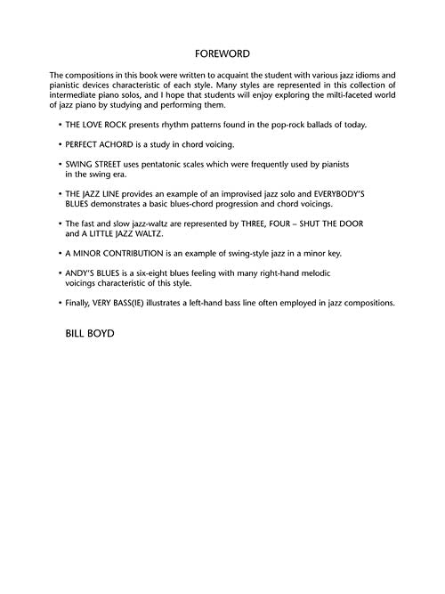 Another great collection of 10 jazz piano solos by beloved composer Bill Boyd. Like his first book for intermediate students, Jazz Delights, this second solo collection explores a wide variety of jazz styles from blues to swing, in tunes that are sophisticated and yet immediately available to students eager to embrace jazz performance. Bill's original solos lay out essential style elements in a non-threatening way, and provide students with ample opportunity to develop finesse through enticing melodies and subtle harmonies. A delightful collection of pieces, sure to please any age. Keys: full range; Reading: full range of keyboard; syncopation; 2 - 4 page solos; 40 pages. 10 solos: Andy's Blues · Everybody's Blues · The Jazz Line · A Little Jazz Waltz · The Love Rock · A Minor Contribution · Perfect Achord · Swing Street · Three, Four - Shut the Door! · Very Bass(Ie).