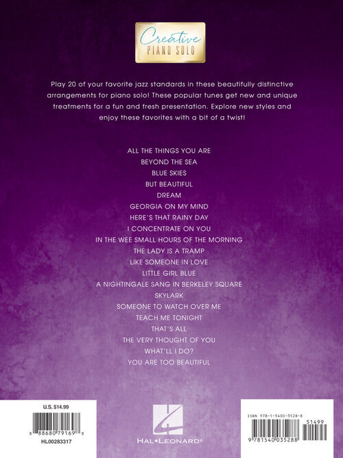 Looking to add some variety to your playing? Check out the Creative Piano Solos series that provides innovative and interesting twists on favorite songs for the intermediate to advanced player. This volume features 20 jazz standards reimagined: All the Things You Are · Blue Skies · But Beautiful · Georgia on My Mind · Here's That Rainy Day · The Lady Is a Tramp · A Nightingale Sang in Berkeley Square · Skylark · Someone to Watch Over Me · That's All · The Very Thought of You · What'll I Do? · and more.