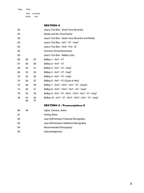 This book by renowned young Hammond B-3 organist Joey DeFrancesco encompasses blues and bebop lines and progressions. It includes: music examples for practice and study; examples and lines in all 12 keys; transcriptions and improvisations with harmonic analysis for two tunes; and Joey playing the examples in different tempos on the audio examples, with and without the right hand. In addition, there are two transcriptions of his compositions and improvisations with harmonic analysis of Big Bad Jim and Lights, Camera, Action. The audio tracks are all accessed online via streaming or download. For piano, organ and synth.