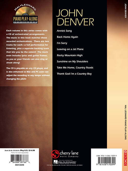 Play 8 of your favorite songs with sound-alike CD tracks. Each volume in this series comes with a CD of orchestrated arrangements. The music in this book matches these recorded orchestrations. There are two tracks for each - a full performance for listening, plus a separate backing track which lets you be the soloist! The music even includes a separate vocal staff, plus guitar frames, so you or your friends can also sing or strum along! This volume includes 8 songs: Annie's Song · Back Home Again · I'm Sorry · Leaving on a Jet Plane · Rocky Mountain High · Sunshine on My Shoulders · Take Me Home, Country Roads · Thank God I'm a Country Boy.