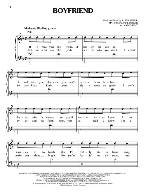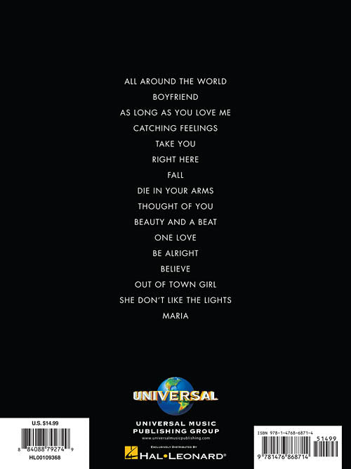 The easy piano edition of Bieber's hit album features 16 songs: All Around the World · As Long as You Love Me · Be Alright · Beauty and a Beat · Believe · Boyfriend · Catching Feelings · Die in Your Arms · Fall · Maria · One Love · Out of Town Girl · Right Here · She Don't Like the Lights · Take You · Thought of You.