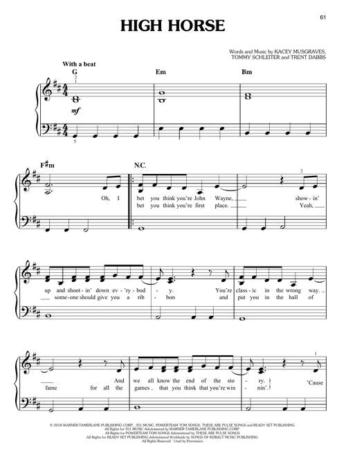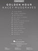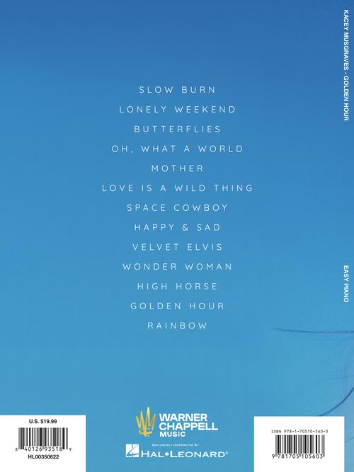 13 tracks from the 2019 Grammy® and CMA award winner for Album of the Year by country diva Kacey Musgraves, arranged for easy piano with lyrics. Includes: Butterflies · Golden Hour · Happy & Sad · High Horse · Lonely Weekend · Love Is a Wild Thing · Mother · Oh, What a World · Rainbow · Slow Burn · Space Cowboy · Velvet Elvis · Wonder Woman.