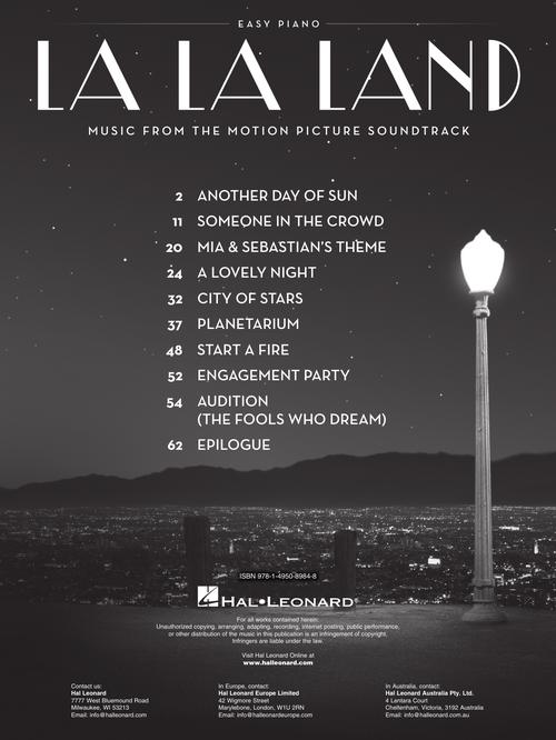 La La Land is the breakout movie of 2017, winning a record number of Golden Globe Awards, including Best Original Score for Justin Hurwitz, and earning a record-tying number of Oscar nominations. This songbook features ten songs from the movie in easy piano arrangements with lyrics: Another Day of Sun · Audition (The Fools Who Dream) · City of Stars · Engagement Party · Epilogue · A Lovely Night · Mia & Sebastian's Theme · Planetarium · Someone in the Crowd · Start a Fire.
