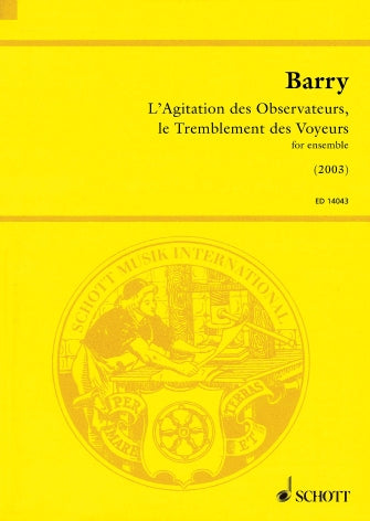 I dont speak French but realised I could say grand things in this language using words common to French and English. This is how L'Agitation des Observateurs, Le Tremblement des Voyeurs came about. In this piece, the sound of the ensemble should be completely integrated and balanced, all instruments being equal in volume. Even though the trumpeter stands in front of the ensemble, his sound should be part of it and not be louder. This piece was commissioned by the Huddersfield Festival of Contemporary Music and premiered the Ives Ensemble with by Marco Blaauw in 2003. Gerald Barry