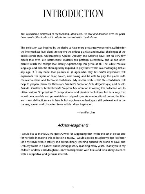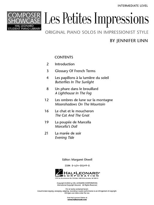 This collection was inspired to meet the need for more preparatory literature for the intermediate level pianist that explores the unique pianistic and musical challenges of the Impressionist style. Pianists who study this stunning collection will experience the layers of color, touch, and timing so necessary to a fine interpretation of this style. Musical directions are written in French throughout and a glossary of French musical terms is included. Solos include: The Cat and the Gnat · Evening Tide · Moonshadows on the Mountain · Butterflies in the Sunlight · A Lighthouse in the Fog · Marcella's Doll.