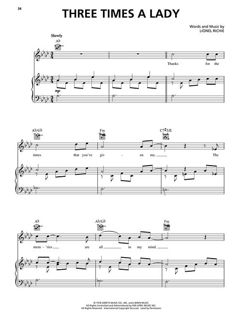 Your favorite sheet music will come to life with the innovative Piano Play-Along series! With these book/CD collections, piano and keyboard players will be able to practice and perform with professional-sounding accompaniments. Containing eight cream-of-the-crop songs each, the books feature new engravings, with a separate vocal staff, plus guitar frames, so players and their friends can sing or strum along. The CDs feature two tracks for each tune: a full performance for listening, and a separate backing track that lets players take the lead on keyboard. The high-quality, sound-alike accompaniments exactly match the printed music. 8 songs: All Night Long (All Night) · Lady · Penny Lover · Say You, Say Me · Still · Stuck on You · Three Times a Lady · Truly.