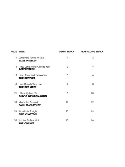 Your favorite sheet music will come to life with the innovative Piano Play-Along series! With these book/CD collections, piano and keyboard players will be able to practice and perform with professional-sounding accompaniments. Containing eight cream-of-the-crop songs each, the books feature new engravings, with a separate vocal staff, plus guitar frames, so players and their friends can sing or strum along. The CDs feature two tracks for each tune: a full performance for listening, and a separate backing track that lets players take the lead on keyboard. The high-quality, sound-alike accompaniments exactly match the printed music. Volume 7 includes: Can't Help Falling in Love · (They Long to Be) Close to You · Here, There and Everywhere · How Deep Is Your Love · I Honestly Love You · Maybe I'm Amazed · Wonderful Tonight · You Are So Beautiful.