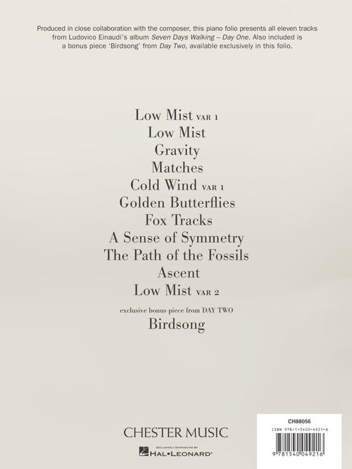 Seven Days Walking is the title of the new album by Ludovico Einaudi, released on March 15, 2019, three and a half years after Elements and a triumphal world tour. Though the instrumentation for the album is for piano, violin, viola, and cello, the matching music folio for the album arranges the music for piano solo. Seven Days Walking is divided into seven episodes, seven albums (Day One, Day Two, etc. until Day Seven), which will be released at monthly intervals. This music folio includes the music in Day One. Each episode is focused on several main themes, which are recurring in different form: seven variations following the same imaginary itinerary. Or the same itinerary, retraced in seven different moments, with the episodes modeled on the days of the week. I remember that in January 2018 I often went for long walks in the mountains, always following more or less the same trail. It snowed heavily, and my thoughts roamed free inside the storm, where all shapes, stripped bare by the cold, lost their contours and colors. Perhaps that feeling of extreme essence was the origin of this album. Each episode features variations on themes that came to Einaudi as he walked over the same snowy route, with the episodes modeled on the days of the week. The idea first came to me as I was listening to the recordings of the first sessions: each version seemed to me to have its own personality, with subtleties so distinct from one another that I was unable to choose which I preferred. I associated everything with walking, with the experience of following the same routes over and over, discovering new details each time. And so in the end I decided to thread them all together in a sort of musical labyrinth, a little like stepping inside the twists and turns of the creative process, to understand how a musical idea can develop in multiple directions, and changing once again at the moment in which it is heard. Lauded as his masterpiece, Seven Days Walking is the latest in the esteemed composer and pianist's amazing body of work. Einaudi is the most streamed classical artist, clocking over two billion streams. His music has graced film soundtracks such as Xavier Dolan's Mommy and Russell Crowe's The Water Diviner. Seven Days Walking was recorded between September and October 2018 in Schloss Elmau (Germany) and Air Studios in London. Includes: Ascent · Birdsong · Cold Wind Var. 1 · Fox Tracks · Golden Butterflies · Gravity · Low Mist · Low Mist Var. 1 · Low Mist Var. 2 · Matches · A Sense of Symmetry.
