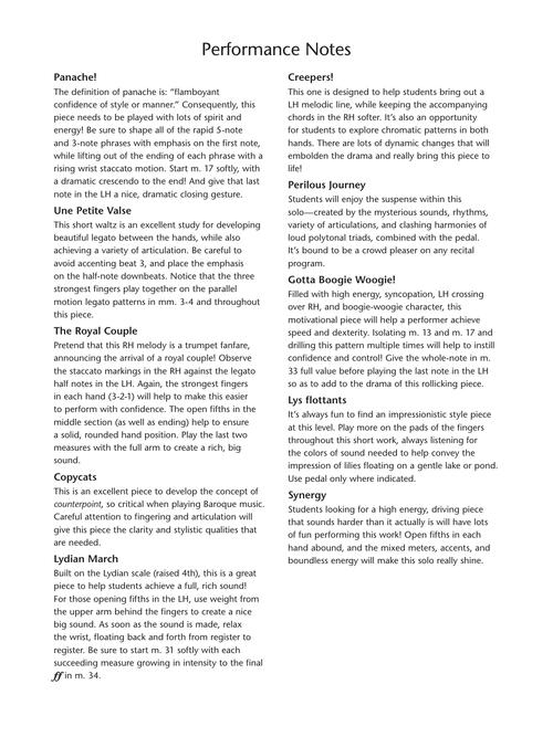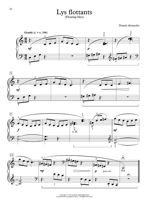 Overture has been defined as an introduction to something more substantial. Dennis Alexander's Overture series is just that! Magical Overtures is the second of three and includes 10 original pieces perfect for auditions, festivals, and recitals. Featuring everything from mixed meters to boogie woogie learning patterns, it's all here! Titles: Copycats · Creepers · Gotta Boogie Woogie · Lydian March · Lys flottants (Floating Lilies) · Panache! · Perious Journey · The Royal Couple · Synergy · Une petite valse.