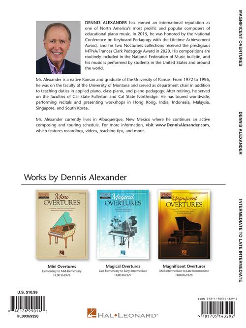 Overture has been defined as an introduction to something more substantial. Dennis Alexander's Overture series is just that! Magnificent Overtures is the final volume and features repertoire perfect for auditions, festivals, and recitals. Featuring everything from mixed meters to a romantic waltz to impressionism, it's all here! Titles: Boundless Joy · Capriccio in E Minor · Gardens in the Mist · Juxtaposition · Mystical Odyssey · Scherzo Chromatique · Serenity · · Whimsy! · Valse Sentimentale.