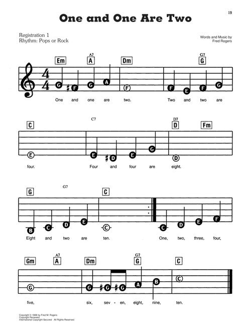 25 fun and creative songs from this timeless children's show in our patented E-Z Play® Today notation. Includes the theme song Won't You Be My Neighbor? (It's a Beautiful Day in the Neighborhood) plus: Are You Brave? · Days of the Week · Everything Grows Together · It's Such a Good Feeling · One and One Are Two · Sometimes People Are Good · Tree, Tree, Tree · You're Growing · You Can Never Go Down the Drain · and more.