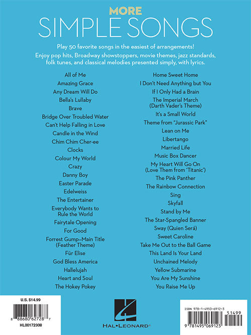 The first edition of our easiest of easy piano songs collection was such a success that we found 50 more favorite songs in the easiest of arrangements presented simply, with lyrics. Songs include: All of Me · Brave · Crazy · Danny Boy · Edelweiss · Für Elise · Hallelujah · It's a Small World · Lean on Me · Music Box Dancer · The Pink Panther · Sing · This Land Is Your Land · Unchained Melody · You Raise Me Up · and more.