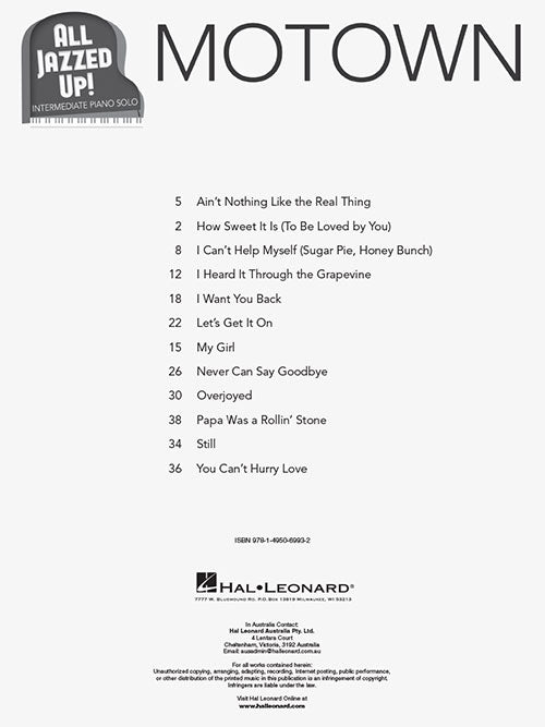 In this series, pop hits receive unexpected fresh treatments. Uniquely reimagined and crafted for intermediate piano solo, these favorites have been All Jazzed Up! Play 12 tunes from the legendary record label: Ain't Nothing Like the Real Thing · How Sweet It Is (To Be Loved by You) · I Heard It Through the Grapevine · I Want You Back · Let's Get It On · My Girl · Overjoyed · Papa Was a Rollin' Stone · You Can't Hurry Love · and more.