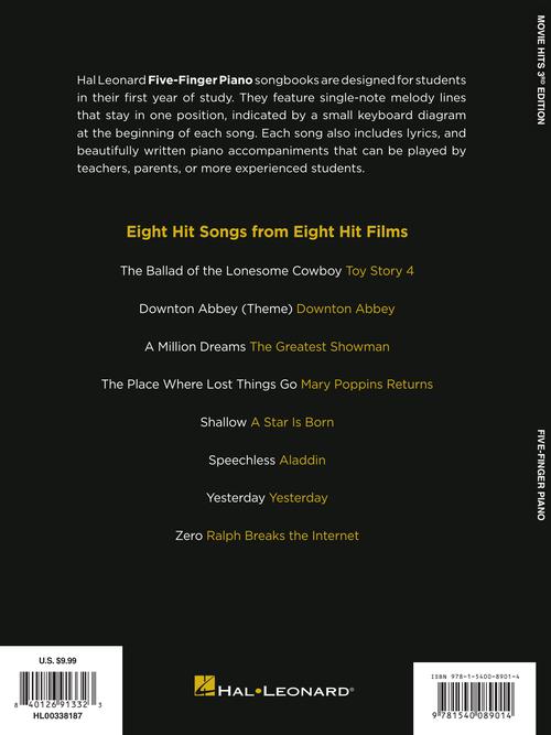 Eight hit songs from eight hit films in accessible 5-finger piano arrangements: The Ballad of the Lonesome Cowboy (from Toy Story 4) · Downton Abbey (Theme) · A Million Dreams (from The Greatest Showman) · The Place Where Lost Things Go (from Mary Poppins Returns) · Shallow (from A Star Is Born) · Speechless (from Aladdin) · Yesterday · Zero (from Ralph Breaks the Internet).