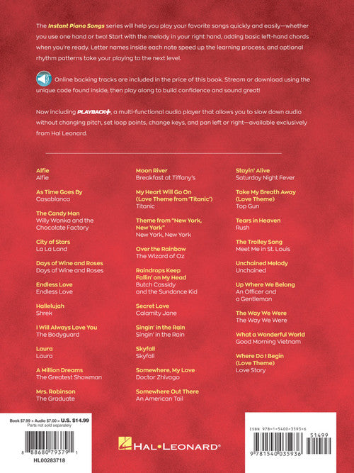 The Instant Piano Songs series will help you play your favorite songs quickly and easily - whether you use one hand or two! Start with the melody in your right hand, then add basic left-hand chords when you're ready. Letter names inside each note speed up the learning process, and optional rhythm patterns take your playing to the next level. Online backing tracks are also included. Stream or download the tracks using the unique codes inside each book, then play along to build confidence and sound great! This edition includes 30 movie hits such as: Alfie · City of Stars · Endless Love · Hallelujah · I Will Always Love You · A Million Dreams · Moon River · Over the Rainbow · Singin' in the Rain · Somewhere Out There · Stayin' Alive · Tears in Heaven · Unchained Melody · What a Wonderful World · and more. Audio is accessed online using the unique code inside the book and can be streamed or downloaded. The audio files include PLAYBACK+, a multi-functional audio player that allows you to slow down audio without changing pitch, set loop points, change keys, and pan left or right.