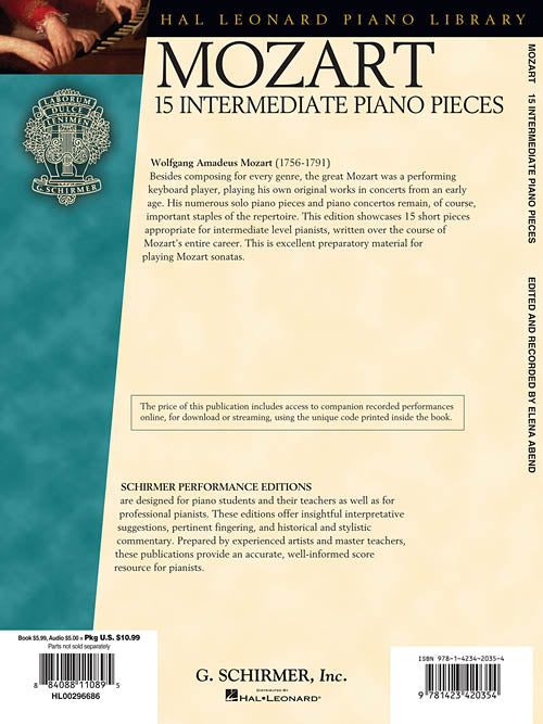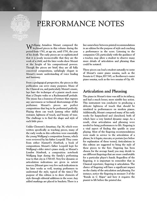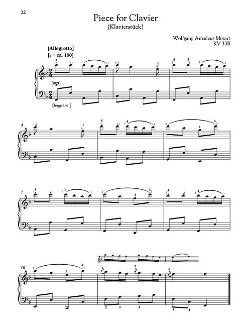 This collection features often-taught music spanning Mozart's entire career, pieces that prepare students for playing his sonatas. CONTENTS: Andantino in E-Flat Major, KV 236 (588b) · Minuet in F Major, KV 1d · German Dance in C Major, KV 605, No. 3 · Minuet in F Major, KV 5 · Contradance in G Major, KV 269b · Minuet in F Major, KV 6 (II) · Adagio for Glass Harmonica, KV 356 (617a) · Funeral March for Signor Maestro Contrapunto, KV 453a · Allegro in F Major, KV Anh. 109b, No. 1 (15a) · Minuet in G Major, KV 15y · Rondo in C Major, KV 334 (320b) · Piece for Clavier (Klavierstuck), KV 33B · Contradance in D Major, KV 534 · Gavotte in F Major, KV Anh. 10(299b) · Rondo in F Major, KV 15hh