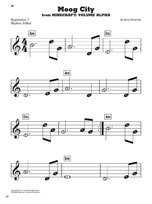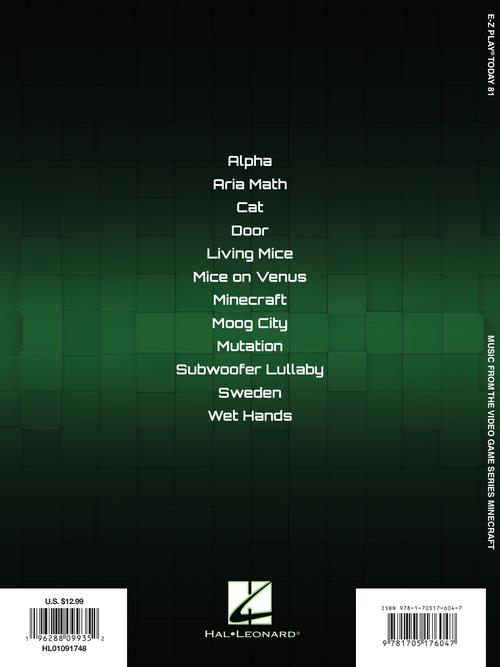 Perfect for fans of the popular video game score just getting started with piano! E-Z Play Today songbooks feature simple arrangements with authentic-sounding chords and melody lines with a minimum number of page turns. The books also include lyrics for ultimate playing and sing-along enjoyment. This volume features 12 well-known tracks, including: Alpha · Aria Math · Cat · Door · Living Mice · Mice on Venus · Minecraft · Sweden · Moog City · Mutation · Subwoofer Lullaby · Wet Hands.