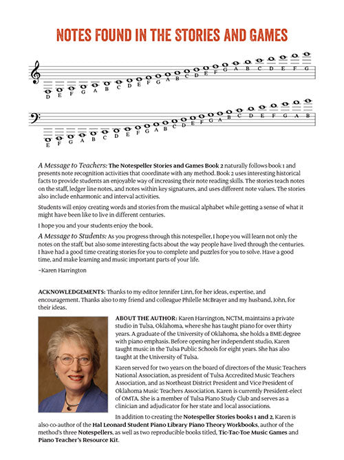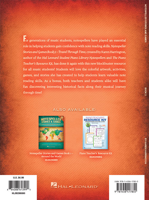 For generations of music students, notespellers have played an essential role in helping students gain confidence with note reading skills. Notespeller Stories & Games Book 2 - Travel Through Time, created by Karen Harrington, author of the Hal Leonard Student Piano Library Notespeller and The Piano Teacher's Resource Kit, has done it again with this new blockbuster resource for all music students! Students will love the colorful artwork, activities, games, and stories she has created to help students learn valuable note reading skills. As a bonus, both teachers and students alike will have fun discovering interesting historial facts along their musical journey through time!