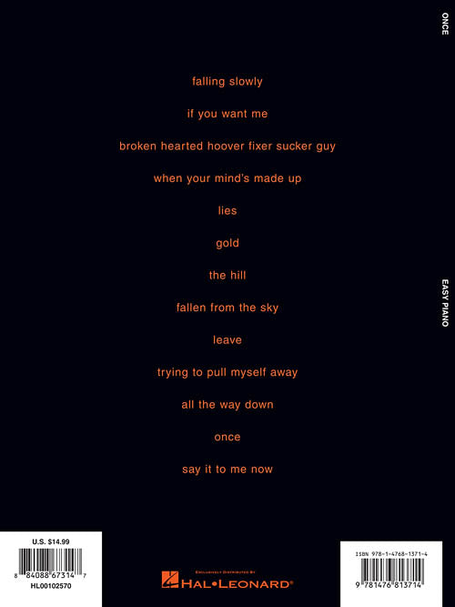 Shot on a shoestring budget, this 2006 Irish musical film captured the hearts of movie-goers - not only with its sweet and authentic plot, but also with its awesome songs, performed by The Frames frontman Glen Hansard and young Czech musician Markéta Irglová, who later banded together as The Swell Season. The soundtrack was nominated for a Grammy, and the lead ballad Falling Slowly won the Academy Award for Best Original Song. The stage adaptation also won the Tony Award for Best Musical. Our folio features easy piano arrangements of 13 tunes: All the Way Down · Broken Hearted Hoover Fixer Sucker Guy · Fallen from the Sky · Falling Slowly · Gold · The Hill · If You Want Me · Leave · Lies · Once · Say It to Me Now · Trying to Pull Myself Away · When Your Mind's Made Up.