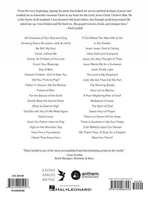Contemporary pianist Paul Cardall released his 3-disc set of his performances of 40 timeless hymns in 2015. Our matching folio features piano solo arrangements of all 40 songs, including: Amazing Grace (for piano, cello and violin) · Be Still, My Soul · For the Beauty of the Earth · God Be with You 'Til We Meet Again · How Firm a Foundation · In the Garden · Jesus Wants Me for a Sunbeam · The Lord Is My Shepherd · Sweet Hour of Prayer · There Is a Green Hill Far Away · Were You There? · and more.