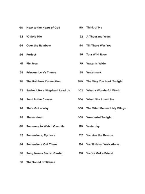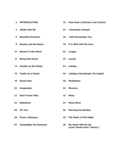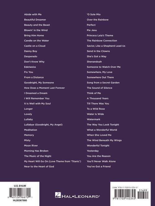 It's super easy! This series features accessible arrangements for piano, with simple right-hand melody, letter names inside each note, basic left-hand chord diagrams, and no page turns. The arrangements also include lyrics. This edition includes 60 calming tunes: Beautiful Dreamer · Bring Him Home · Don't Know Why · From a Distance · I Will Remember You · Lullabye (Goodnight, My Angel) · My Heart Will Go On (Love Theme from 'Titanic') · Perfect · Shenandoah · The Sound of Silence · What a Wonderful World · Yesterday · and more.