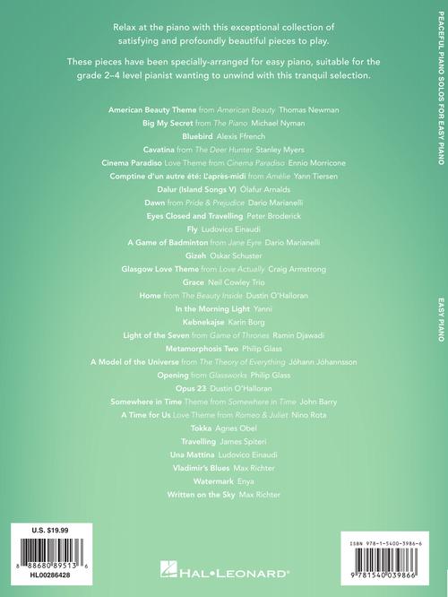 Relax at the piano with this exceptional collection of satisfying and profoundly beautiful pieces to play. Songs include: American Beauty Theme (Thomas Newman) · Big My Secret (from The Piano) (Michael Nyman) · Cinema Paradiso Love Theme (Ennio Morricone) · Dawn (from Pride & Prejudice) (Dario Marianelli) · Fly (Ludovico Einaudi) · In the Morning Light (Yanni) · Light of the Seven (from Game of Thrones) (Ramin Djawadi) · Metamorphosis Two (Philip Glass) · A Model of the Universe (from The Theory of Everything) (Johann Johannsson) · Somewhere in Time Theme (John Barry) · Watermark (Enya) · Written on the Sky (Max Richter) · and more.