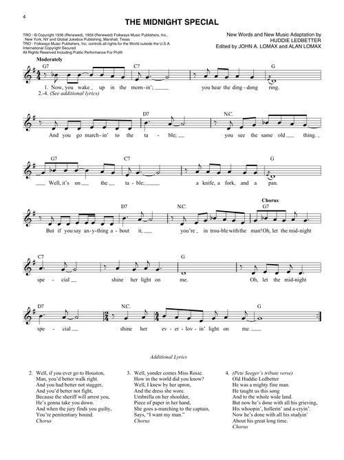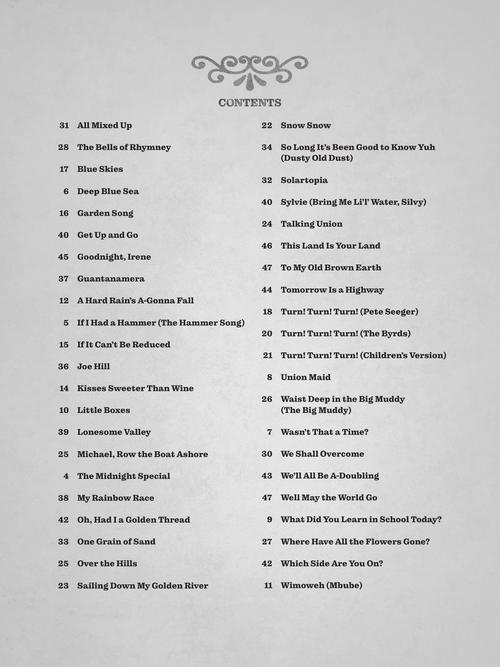 This songbook celebrates the legacy of Pete Seeger with 41 favorites presented with words, melody lines, and chord symbols: All Mixed Up · The Bells of Rhymney · Blue Skies · Goodnight, Irene · Guantanamera · If I Had a Hammer (The Hammer Song) · Lonesome Valley · Michael Row the Boat Ashore · Midnight Special · Over the Hills · So Long It's Been Good to Know Yuh (Dusty Old Dust) · This Land Is Your Land · Turn! Turn! Turn! (To Everything There Is a Season) · We Shall Overcome · Where Have All the Flowers Gone? · and more.